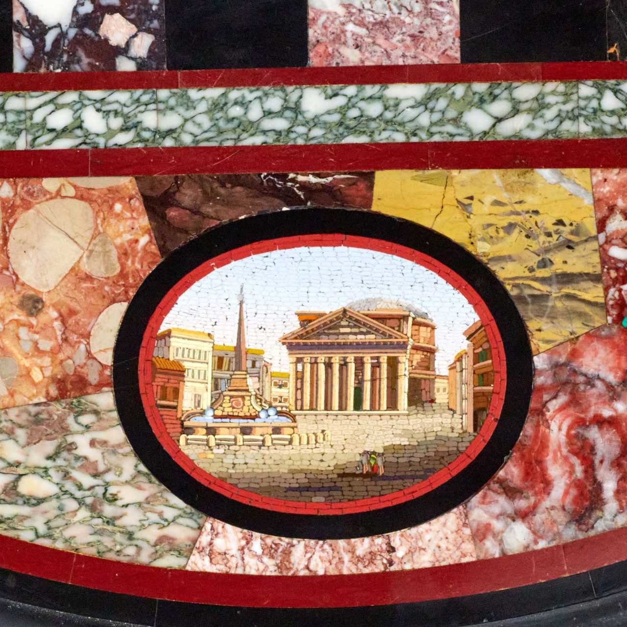 An impressive chess table, crafted in 19th-century Italy, represents an exceptional example of decorative art with a vivid allegory of eternity, embodied both in the chess game and in the eternal city of Rome.The round tabletop, executed in the pietra dura technique (semi-precious stone inlay), is a unique panel combining a chessboard of alternating squares made of jasper, malachite, agate, lapis lazuli, and onyx, framed with micromosaic tondi depicting Roman landmarks: the Colosseum, the Pantheon, St. Peters Square, and the Roman Forum.The colorful mosaic of stones is complemented by architectural micromosaic miniatures—true masterpieces of lapidary art.The table stands on four richly carved Neo-Renaissance legs, each adorned with mascarons in the form of classical busts, spiral acanthus elements, and cross-bracing.Marks: none or not specifiedDimensions: Height – 66 cm; Top diameter – 62 cmCondition: Excellent condition, minimal signs of wearOrigin: Italy, 19th century