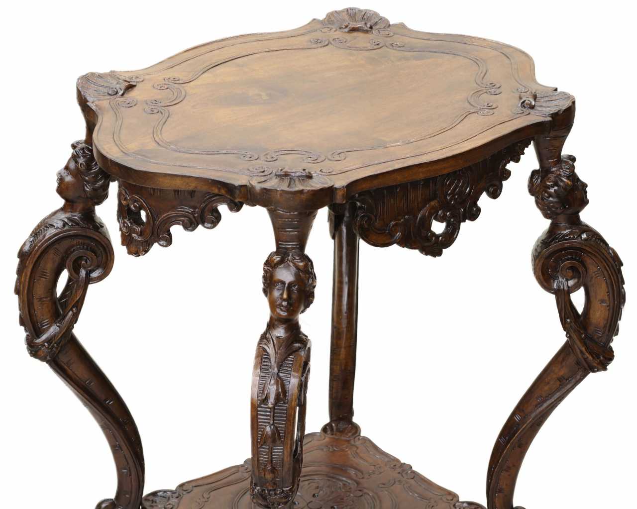 Carved wooden table in the neo-Roccoco style of the turn of the 19th century, on curved legs with paws and half-figures of Atlantean tritons, garlands and shells, decorated with Gothic script in the decor of the tabletops. Dimensions: 79x61x51cm.
