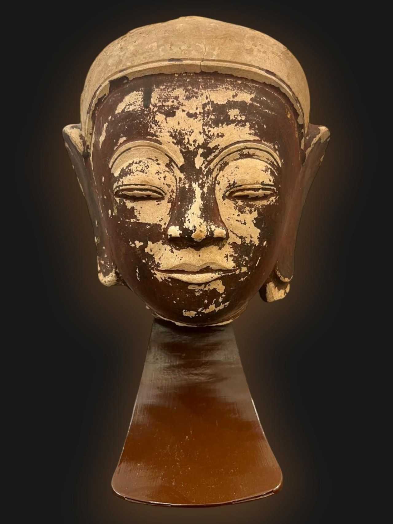 Stoneware Buddha head, Shan State Kingdom, Burma, 16th18th centuryBuddha head from a temple facing built entirely of mud bricks during the 16th18th century. Maravijaya Buddha. Shan period, Burma.The finesse of the master sculptors work is remarkable here: the large almond-shaped eyes with half-closed eyelids advocate introspection and humility, while the fine, well-defined mouth with pronounced corners preaches benevolence and universal love. His head is adorned with the Ushnisha, a cranial protuberance characteristic of Buddha and a symbol of his knowledge. This Buddha exudes emotion and wisdom, inviting the viewers eye and mind to meditative calm and enlightened concentration.This collectors piece stands out for its fine craftsmanship and its expression of wisdom, from which emanates great spirituality. Properly pedestal-mounted, this piece exudes serenity and soothing energy, and can easily be placed in your home on a shelf or in a bookcase.Height 36 cm on base.