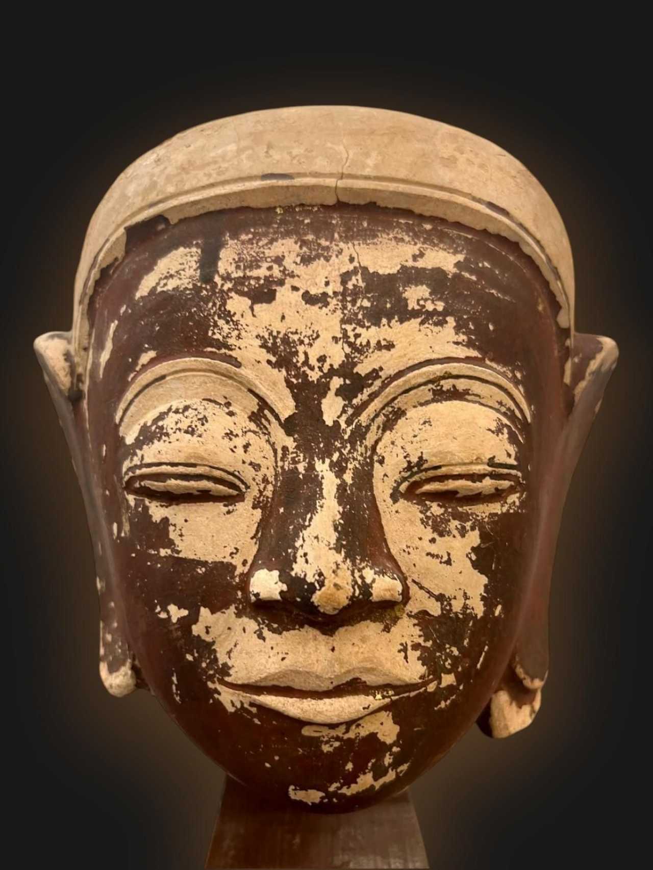 Stoneware Buddha head, Shan State Kingdom, Burma, 16th18th centuryBuddha head from a temple facing built entirely of mud bricks during the 16th18th century. Maravijaya Buddha. Shan period, Burma.The finesse of the master sculptors work is remarkable here: the large almond-shaped eyes with half-closed eyelids advocate introspection and humility, while the fine, well-defined mouth with pronounced corners preaches benevolence and universal love. His head is adorned with the Ushnisha, a cranial protuberance characteristic of Buddha and a symbol of his knowledge. This Buddha exudes emotion and wisdom, inviting the viewers eye and mind to meditative calm and enlightened concentration.This collectors piece stands out for its fine craftsmanship and its expression of wisdom, from which emanates great spirituality. Properly pedestal-mounted, this piece exudes serenity and soothing energy, and can easily be placed in your home on a shelf or in a bookcase.Height 36 cm on base.