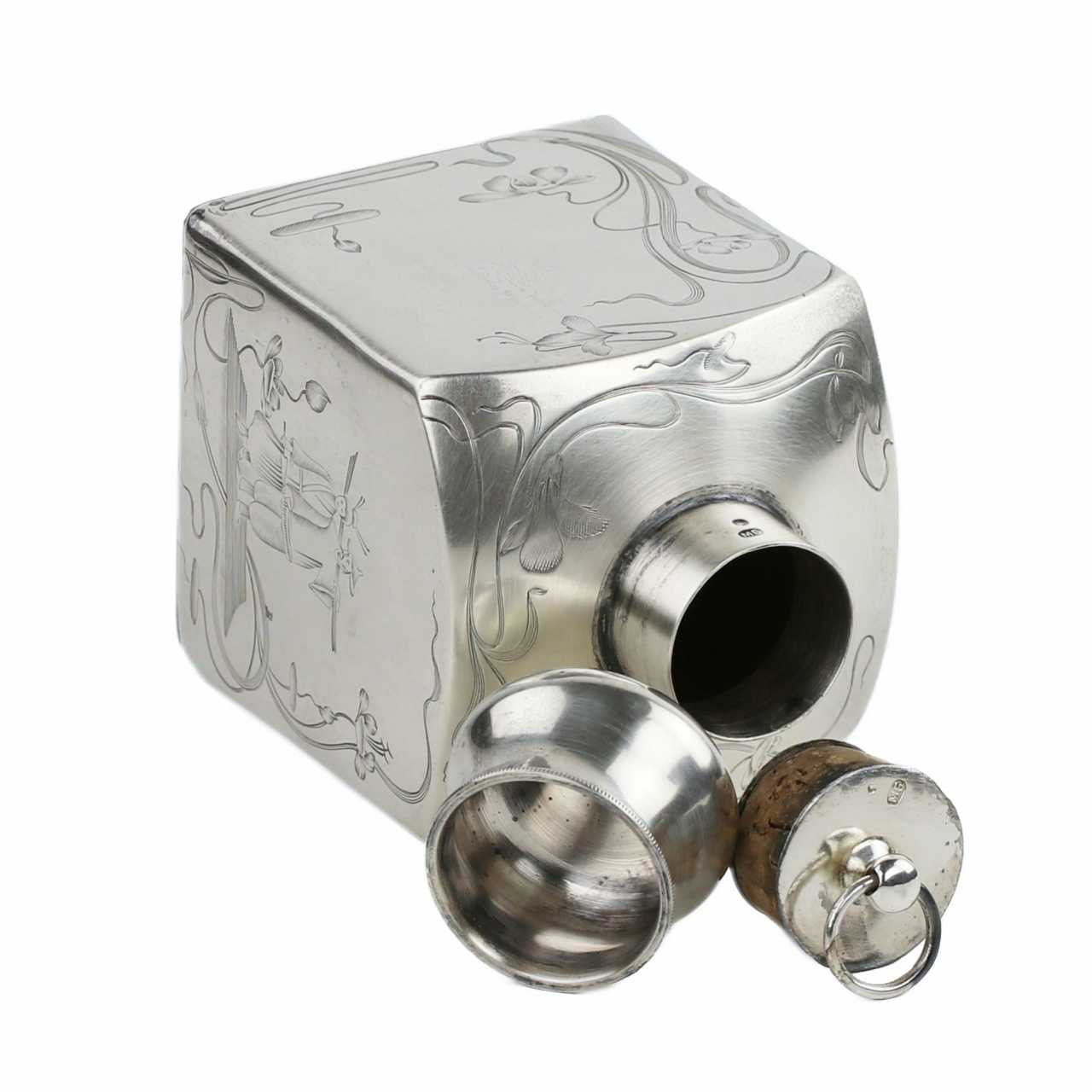 An elegant square silver tea caddy, made in Moscow between 1896 and 1908. The surface of the item is decorated with a refined engraving in the oriental style, which was especially popular in the Art Nouveau era. The front side features a graceful female figure in traditional Chinese dress, surrounded by lotus flower patterns and flowing plant lines. The skillful combination of Russian jewelry craftsmanship and Eastern influence gives the tea caddy a unique appearance and artistic value. Hallmarks: The master`s mark with the initials MB (Belousov Maxim Vasilievich), made in Cyrillic, as well as the Moscow assay mark of the period 1896-1908. Dimensions: Height: 13 cm Width: 8 cm Weight: 336 grams Historical information: Belousov Maxim Vasilievich is a famous Moscow master jeweler, owner of a silver workshop, active in the period 1899-1908.