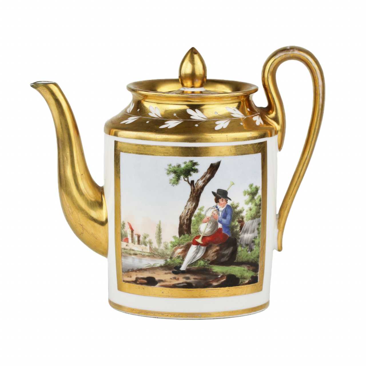 Cylindrical porcelain teapot from the Gardner factory. Russia 1820-30s. Made in the classical spirit and proportions. With scenes of Italian life on the body. The lid and beveled edge of the cylinder are decorated with plant shoots. Porcelain, gilding, painting. Height: 17 cm.