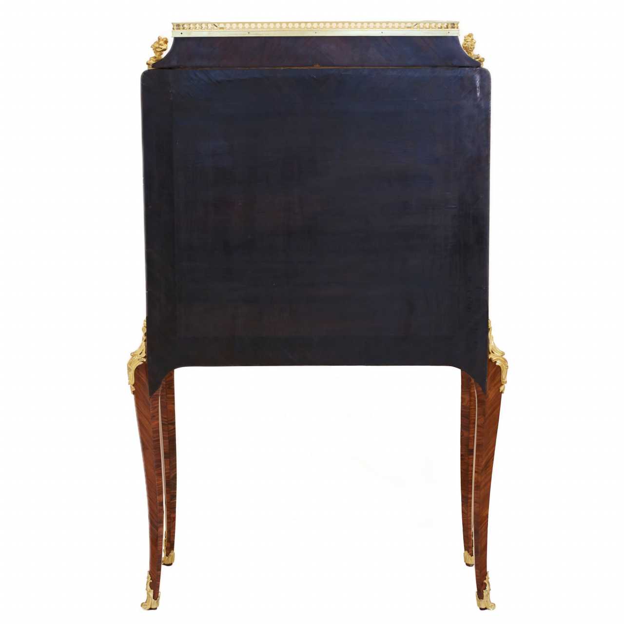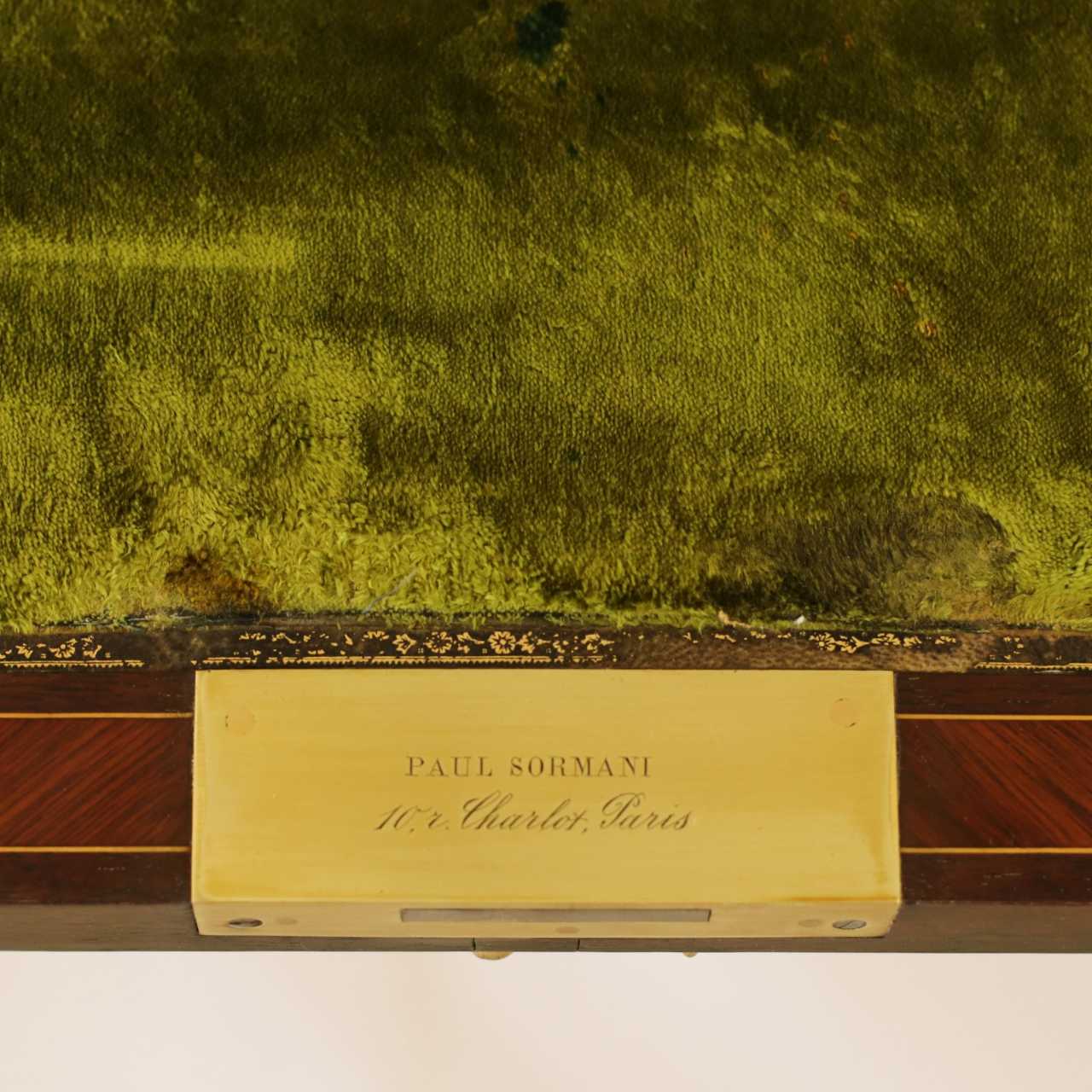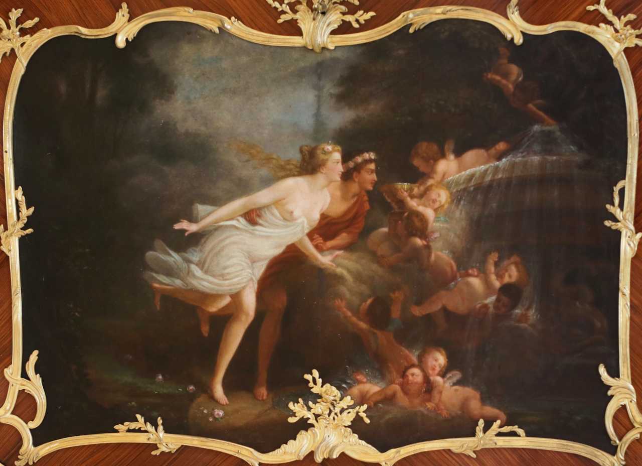 PAUL SORMANI (1817-1877). A magnificent secretary made of royal wood veneer, on curved legs, richly decorated with a large painted panel on the facade and hinged lid of the secretary depicting ancient lovers running to a fountain. Decorated with an ensemble of gilded frames with elements of plant motifs and corner mascarons - flower shoots with sprouted female heads. The drawer is decorated in waves with bronze foliage and touching shoots of handles. The curves of the legs and their bases are also emphasized by the gilded bronze ensemble. From the top, the secretaire ends with a vast platform behind a gilded balustrade. The interior space of the secretary is busily divided by a shelf into two parts, the lower of which is equipped with four small mahogany drawers, the upper of which are turnkey. The writing table is upholstered in green velvet. Lock plate signed Paul Sormani 10 r. Charlotte Paris. Second half of the 19th century. Dimensions: Height: 137 cm. Width: 87 cm. Depth: 39 cm.