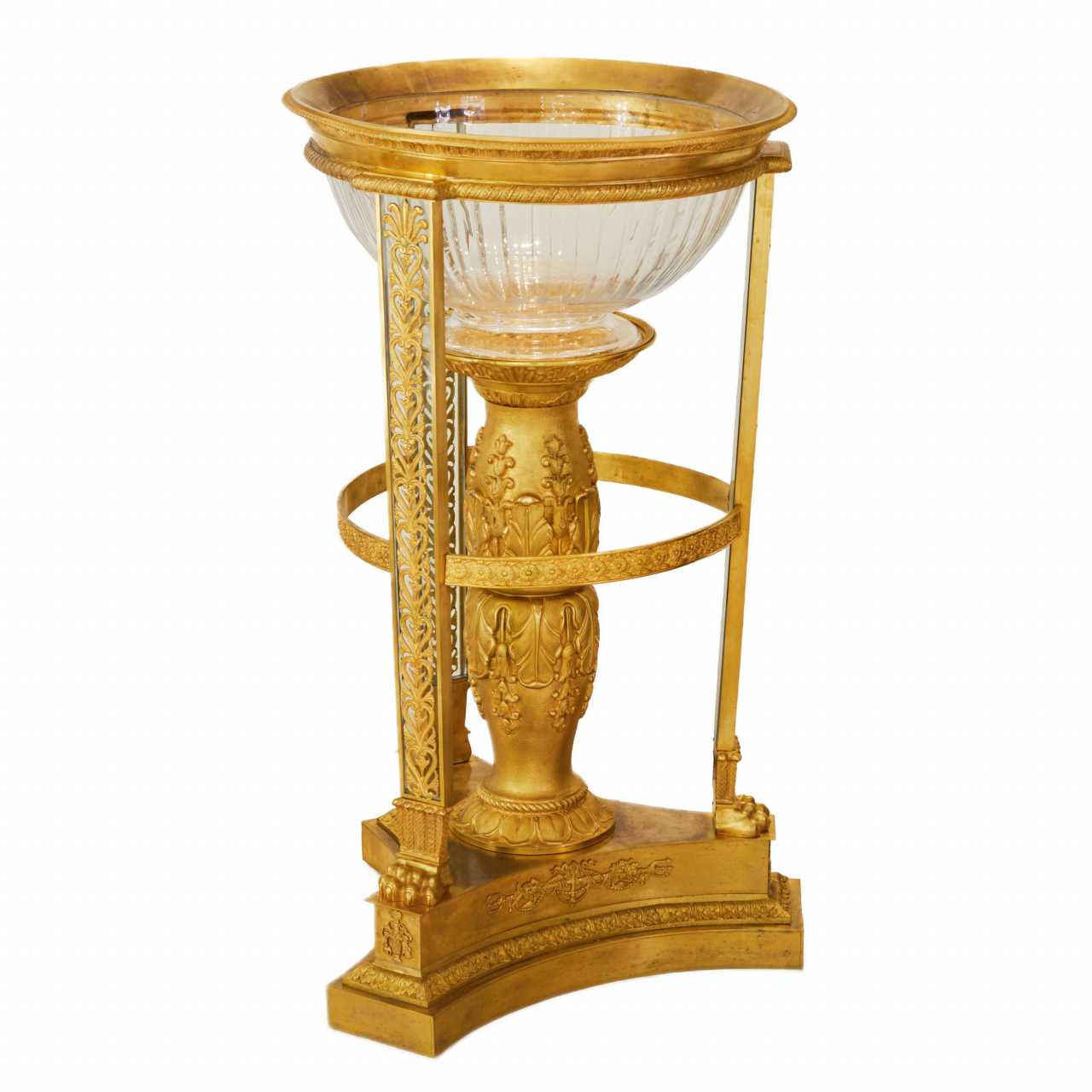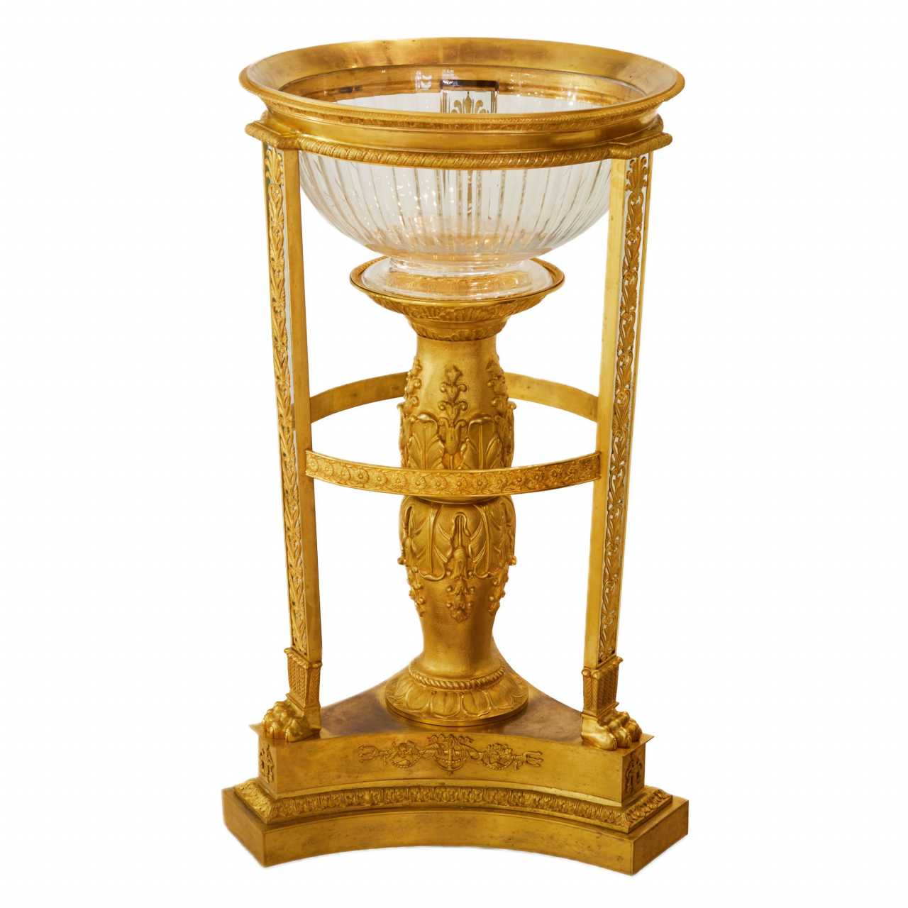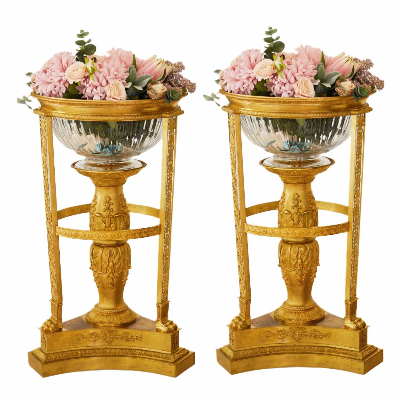 A pair of grandiose floor-mounted jardiniere flowerpots designed for decorating large spaces. They can be combined with bouquets of fresh, dried or artificial flowers. The transparent hemisphere is made of thin fluted glass, presumably Baccarat. The stand, decorative columns, hoops, three-rayed gilded bronze pedestal are decorated with palmettes, grotesques and twisted cord. Decorative stands rest on lion paws. The side surfaces of the pedestals are decorated with decorative overlays. France Turn of the 19th-20th centuries. Bronze, glass, casting, chasing, gilding. Height - 105 cm, diameter - 57 cm.
