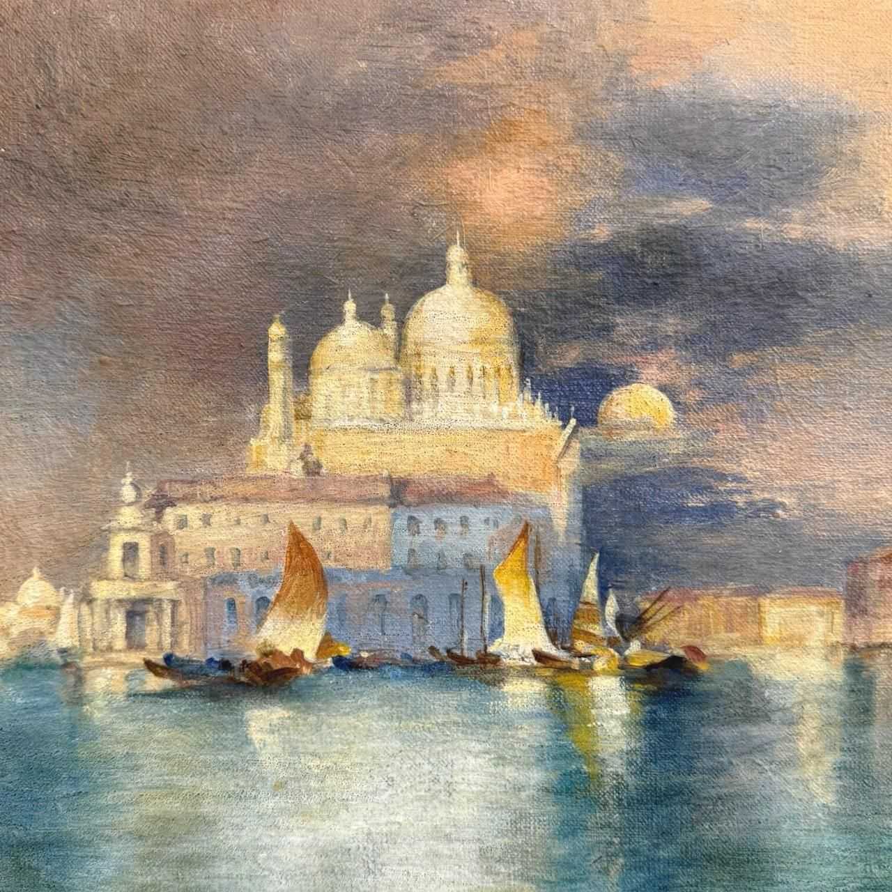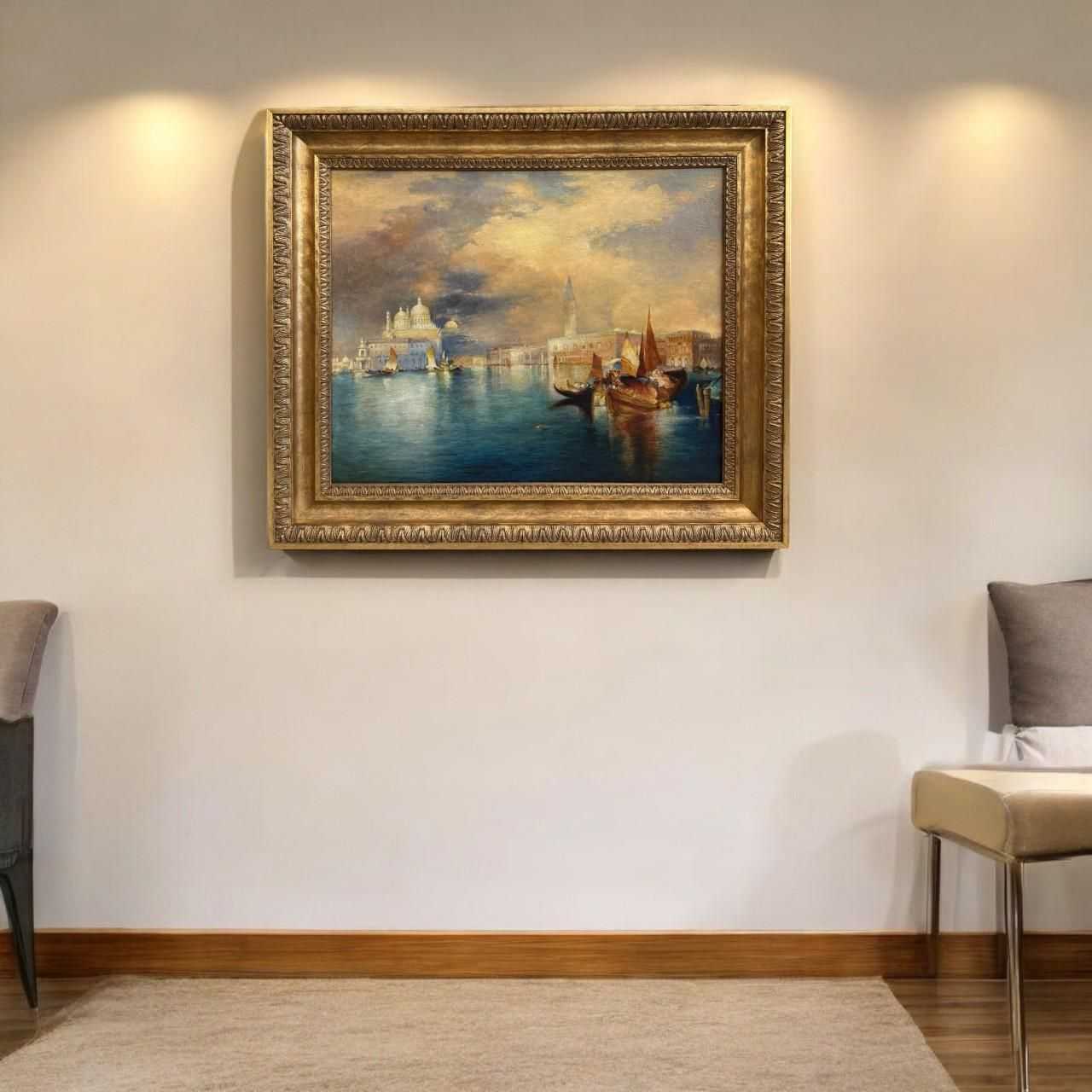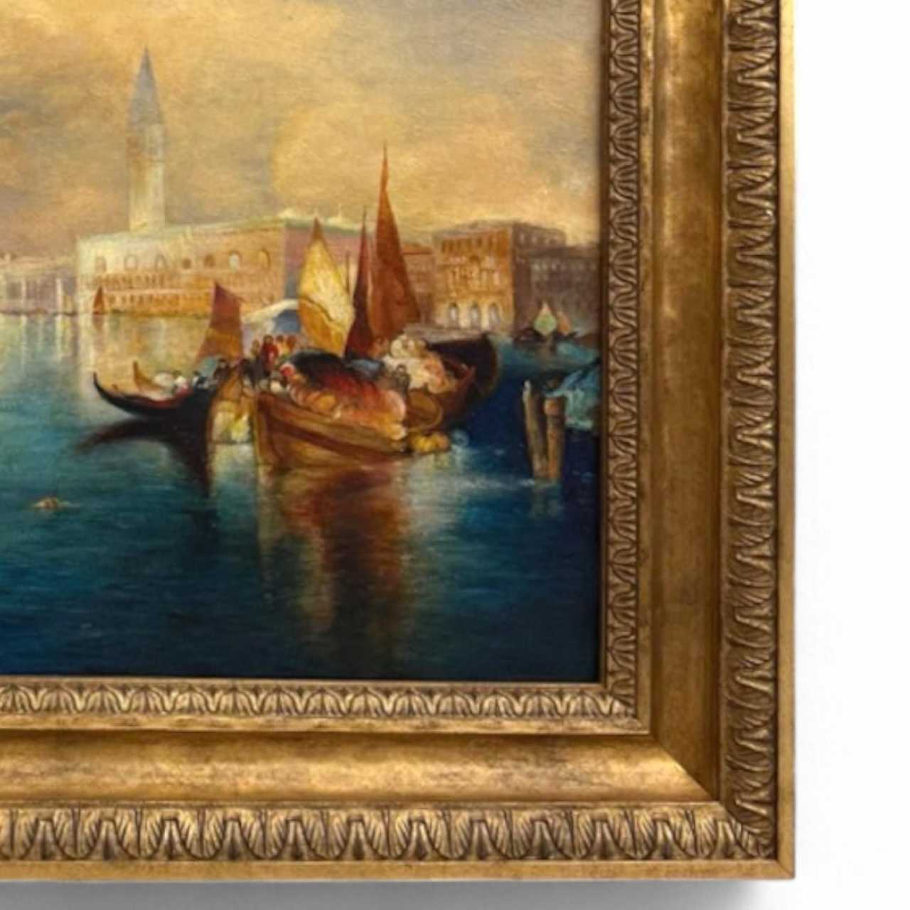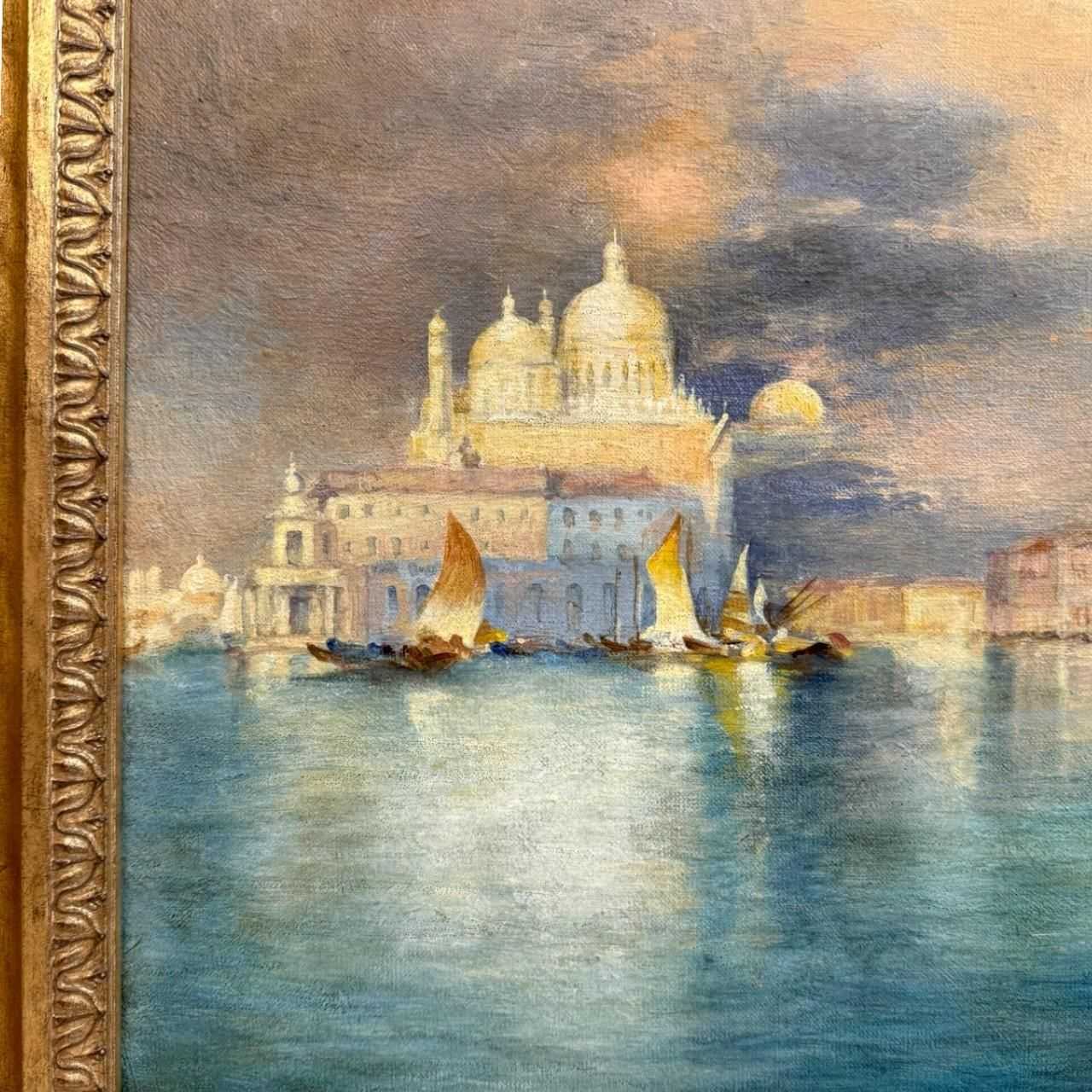 A stunning 19th-century oil on canvas depicting a romantic Venetian harbor at sunset, painted in the classical tradition of European landscape art. This atmospheric composition captures the timeless beauty of Venice, featuring gondolas and sailboats gliding across the shimmering water, set against the backdrop of iconic architecture, including what appears to be the Basilica di Santa Maria della Salute and the Campanile of San Marco.The warm, golden hues of the sky blend gracefully with the cooler blues of the lagoon, creating a luminous and tranquil scene rich in depth and movement.The painting is presented in its original hand-carved wooden frame, finished in a luxurious antique gold. The frame features intricate detailing that complements the elegance and grandeur of the artwork, adding both historical charm and decorative appeal.