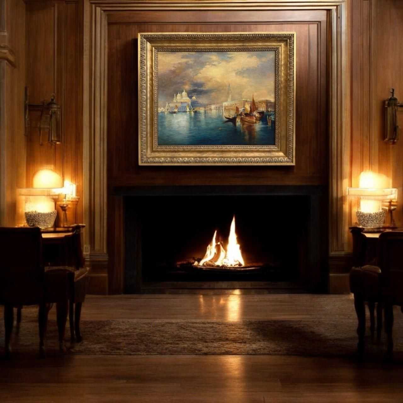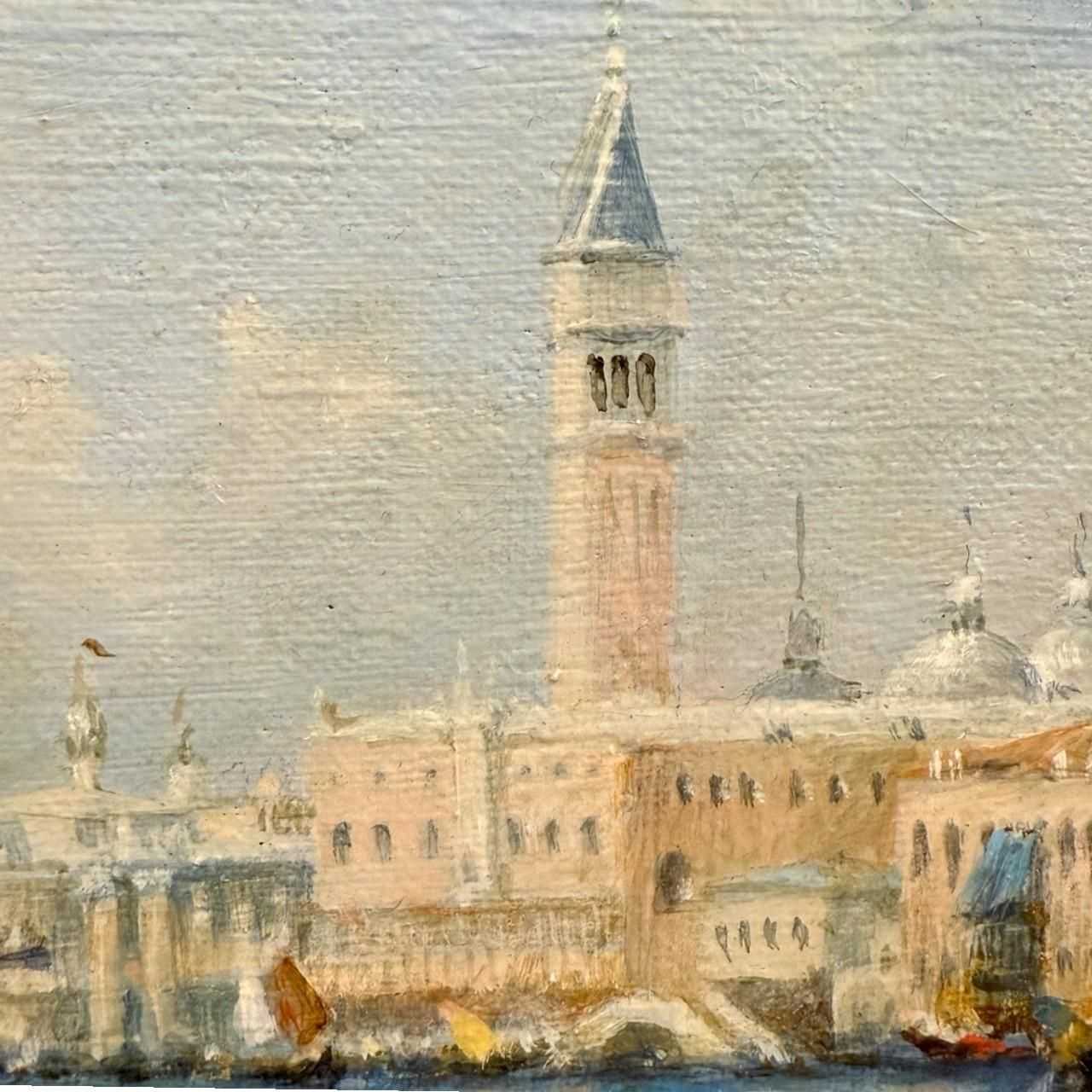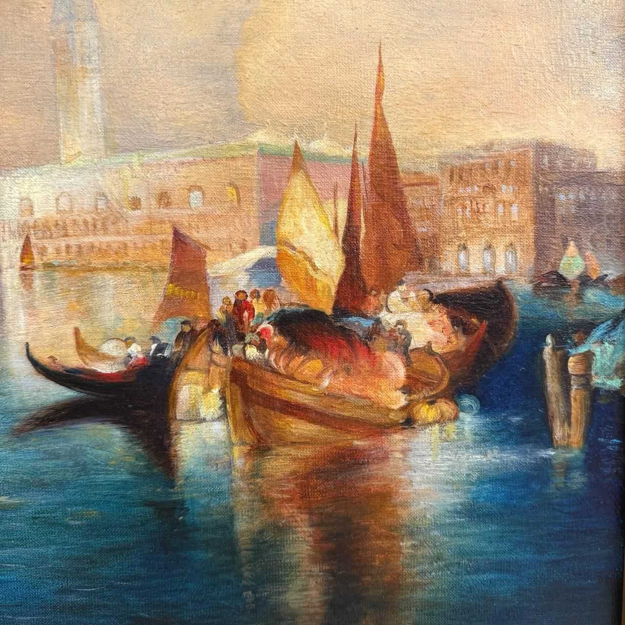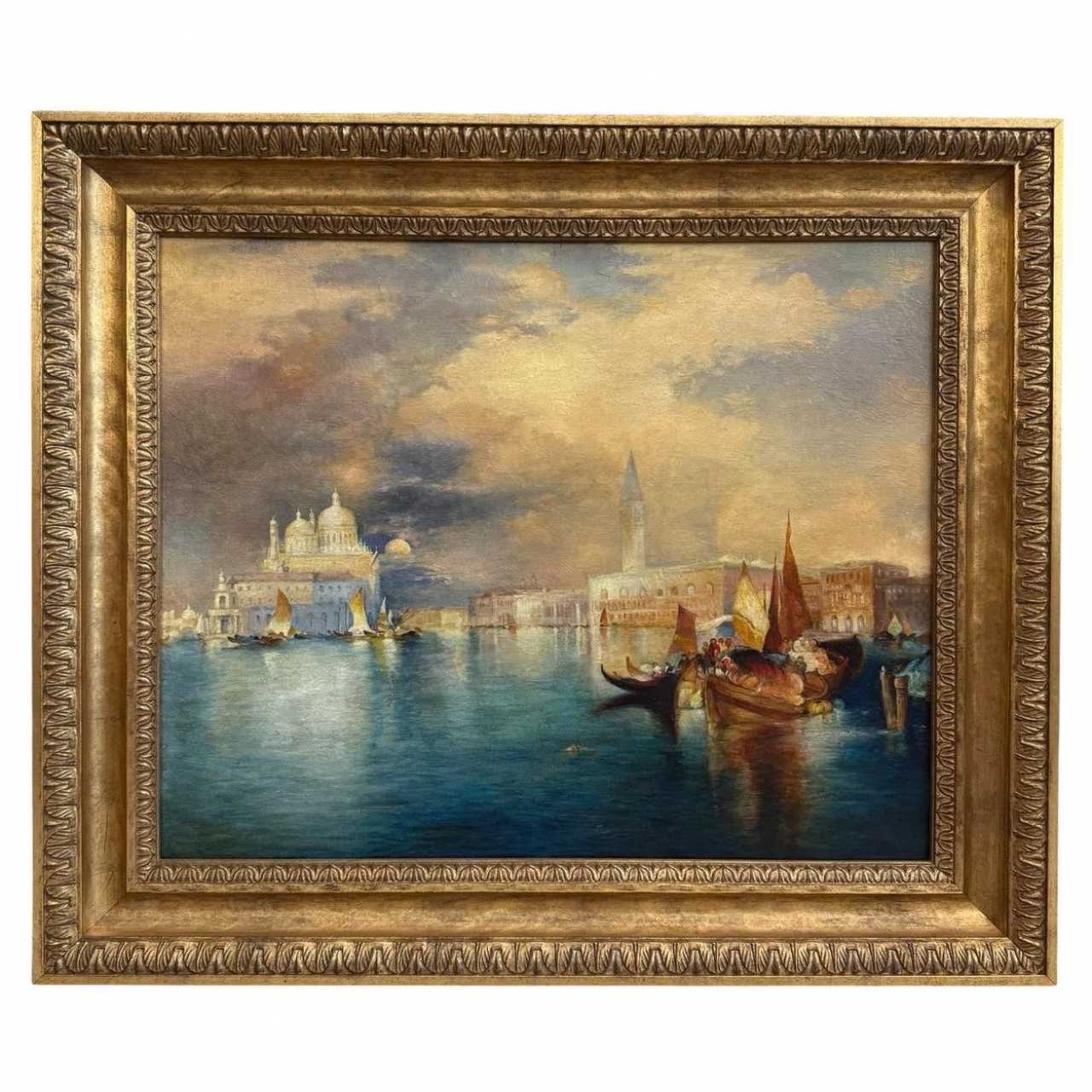 A stunning 19th-century oil on canvas depicting a romantic Venetian harbor at sunset, painted in the classical tradition of European landscape art. This atmospheric composition captures the timeless beauty of Venice, featuring gondolas and sailboats gliding across the shimmering water, set against the backdrop of iconic architecture, including what appears to be the Basilica di Santa Maria della Salute and the Campanile of San Marco.The warm, golden hues of the sky blend gracefully with the cooler blues of the lagoon, creating a luminous and tranquil scene rich in depth and movement.The painting is presented in its original hand-carved wooden frame, finished in a luxurious antique gold. The frame features intricate detailing that complements the elegance and grandeur of the artwork, adding both historical charm and decorative appeal.