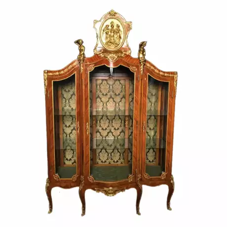 Unique showcase made in the style of Louis XV (Louis Quine). A three-part composition with an accentuated central risalit, decorated with an attic and flanked by half-figures of caryatids. Richly decorated with elements of gilded bronze, carvings and precious woods. The upper part of the showcase is decorated with an oval panel depicting a scene praising the young Sun King. The interior of the showcase is lined with woven fabric, in keeping with the style of the time. Late electrification (lighting). Includes 3 keys.