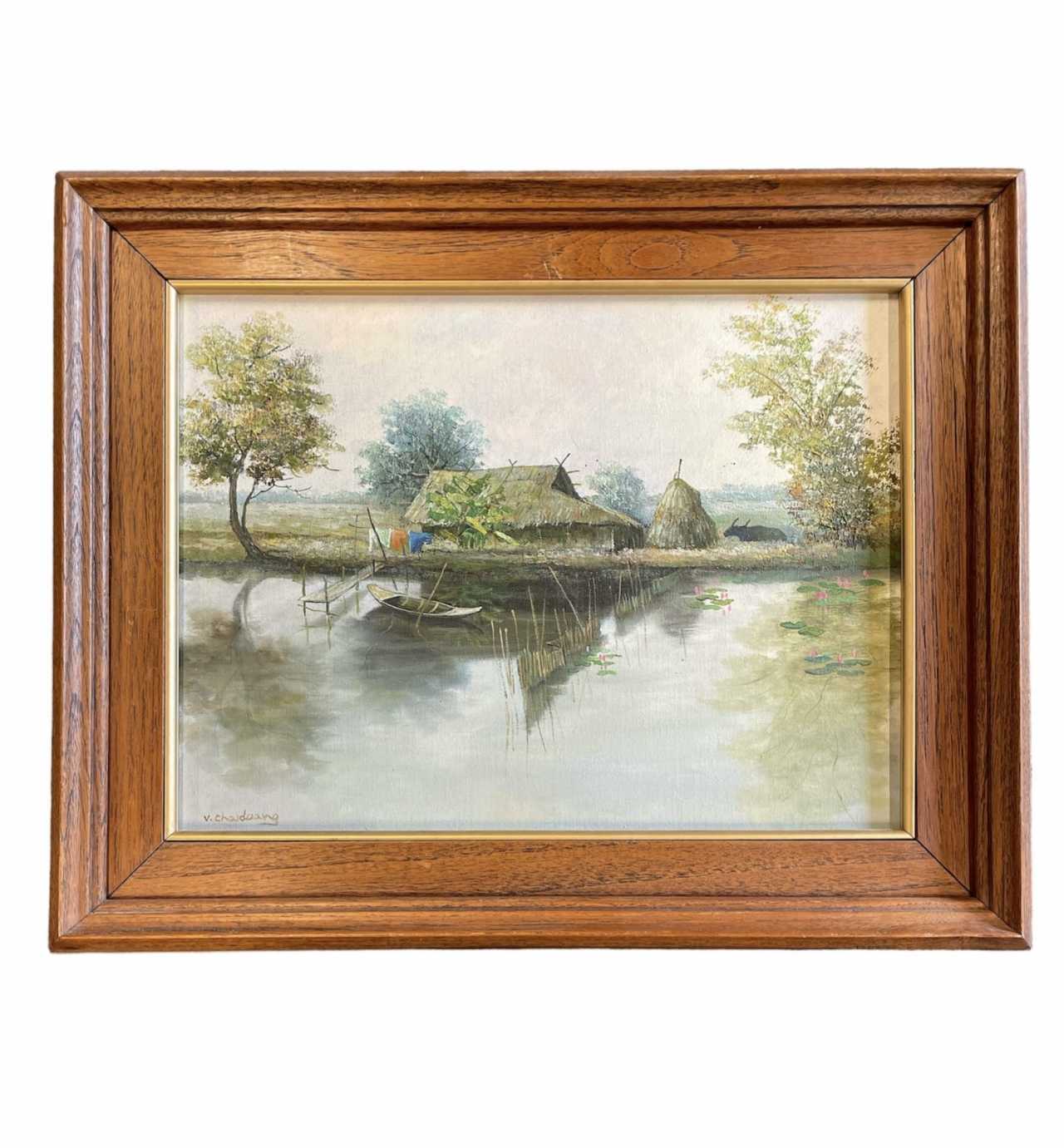 Village View Near the Water by V. Chaiduang (Thai Impressionism, Late 20th Century), Oil on Canvas, 52 x 41 cm