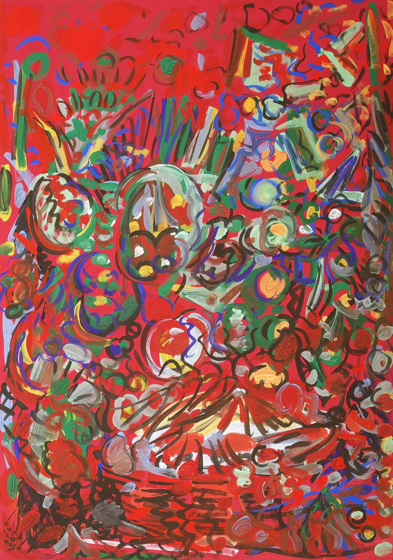Работа исполнена в стиле Абстрактного экспрессионизма, на цветной бумаге, гуашью.