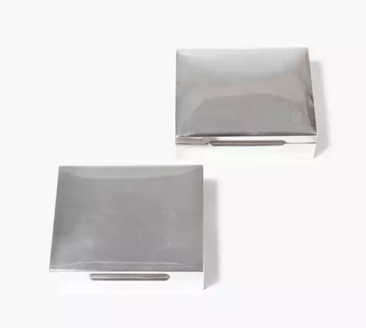 Silber. Meistermarke Franz Johann jun. Blanke Rechteckformen mit scharniertem Deckel und kleinem Gravurdekor, inwendig Holzeinlage. Meistermarke, Feingehalt 835. 12x10 cm.