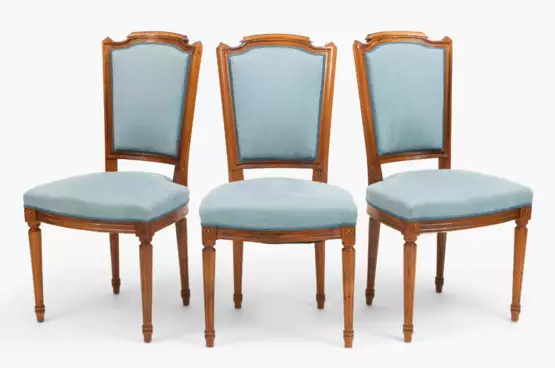 19./20. Jh. Stil Louis XVI. Nussbaumholz. Trapezförmige, gerundete Zarge mit Polstersitz auf schlanken, kannelierten Beinen. Schildförmige, gepolsterte Rückenlehne.