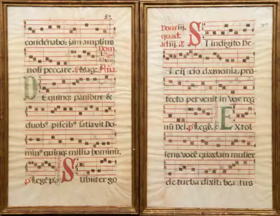 Lot 274 | 2 kolorierte, beidseitig bedruckte Notenblätter auf Pergament um 1500, Altersspuren, an den Rändern knickfaltig, je 60x36,5 cm, hinter Glas und Rahmen