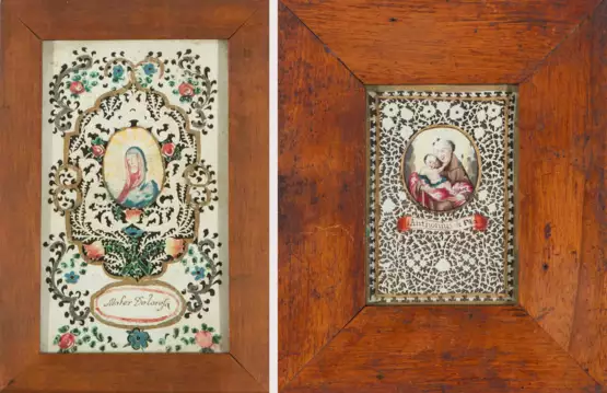 Süddeutsch, 18.Jh. Pergament geschnitten und gestichelt, partiell gouachiert. Zentrale Gouacheminiaturen. Hl. Antonius mit Jesuskind bzw. Schmerzensmutter. Schriftband "S. Anthonius de Pad." bzw. Schriftkartusche "Mater Dolorosa". Ranken- und Ästchenschnitt mit Blumen und Rocaillen. 9,5x6,5 cm bzw. 12x7 cm (Schnitt). Gerahmt.