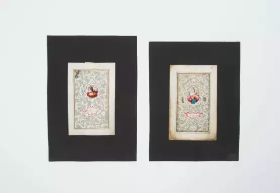 Süddeutsch, um 1770. Pergament geschnitten, gestichelt und genadelt, partiell gouachiert. Zentrale Gouacheminiaturen in Kartuschen. Hl. Kunigunde mit Zepter und Lilienzweig bzw. Hl. Katharina. Schriftkartuschen "S: KUNIGUNDIS" bzw. "S: Catharina". Feiner Netzmaschenschnitt mit Blumen und Rocaillen. 11,5x6,5 cm bzw. 11,5x7 cm (Schnitt). Ungerahmt.