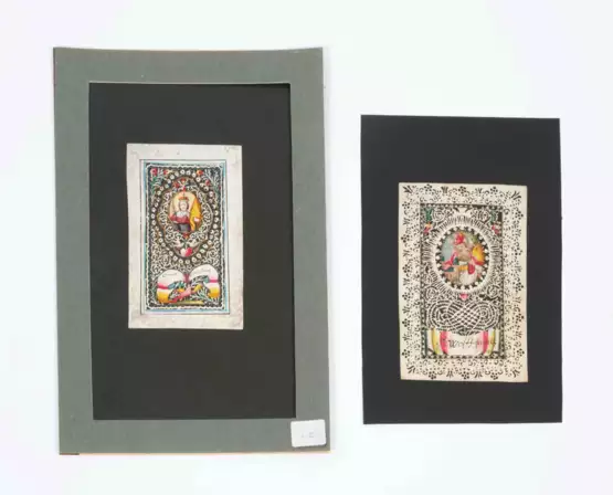 Süddeutsch, 18.Jh. Pergament geschnitten und gestichelt, partiell gouachiert und tlw. in Silber- und Goldbronze gehöht. Ovale Gouacheminiaturen. Hl. Wenzel von Böhmen mit Krone und Hl. Wolfgang mit Kirchenmodell. Schriftbänder "Sanct Wenceslaus" bzw. "S: Wolffgangl". Feiner Spiralranken- und Ästchenschnitt mit Blumen. 12x8 cm bzw. 9x5 cm (Schnitt). Ungerahmt.