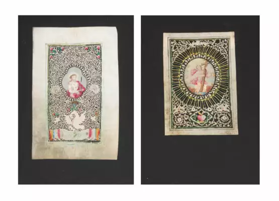 Süddeutsch, 18.Jh. Pergament geschnitten, gestichelt und genadelt, partiell gouachiert und tlw. in Goldbronze gehöht. Zentrale Gouacheminiaturen. Jesuskind mit Kreuz. Gegeisselter Christus mit Schriftband "Ecce Homo". Feiner Spiralranken- bzw. Ästchenschnitt mit Pelikanen. 9,5x6 cm bzw. 5x10 cm (Schnitt). Ungerahmt.