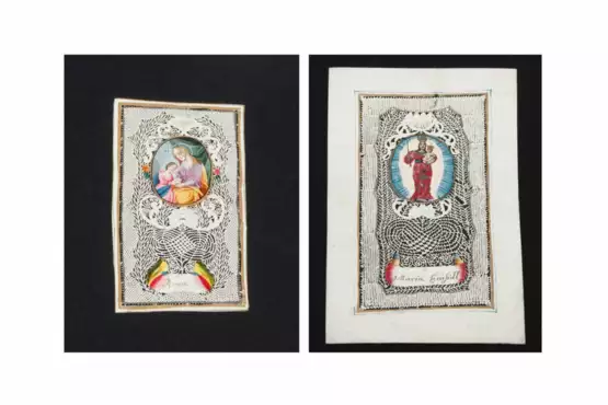 Süddeutsch, 18.Jh. Pergament geschnitten, gestichelt und genadelt, partiell gouachiert sowie tlw. in Silber- und Goldbronze gehöht. (1) Beidseitig ovale Gouacheminiaturen. Recto: Gnadenbild der Maria von Einsiedeln. Schriftband "S Maria Einsidl". Verso: Hl. Rosina mit Schwert und Palmzweig. Schriftband "S Rosina". (2) Hl. Anna, Maria im Lesen unterrichtend. Schriftband "S. Anna". Feinster Spiralranken-, Ästchen- und Netzmaschenschnitt mit Rocaillen und Blumen. 9,5x5 cm und 9,5x5 cm (Schnitt). Ungerahmt.