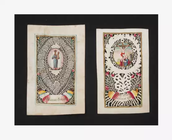 Süddeutsch, 18.Jh. Pergament geschnitten, gestichelt und genadelt, partiell gouachiert und tlw. in Goldbronze gehöht. Ovale Gouacheminiaturen. Gnadenbild der Maria von Einsiedeln und Christus am Kreuz, betrauert von Maria Magdalena. Schriftbänder "S Maria Einsidl" bzw. "Amor meus / Crucifixus est". Feiner Spiralranken- bzw. Ästchenschnitt mit Netzmaschenschnitt (Maria Einsiedeln) bzw. mit Rocaillen. 9,5x5 cm bzw. 10x5 cm (Schnitt). Ungerahmt.