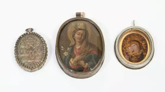 18./19.Jh. (1) Ovale Kapsel aus Messing. Unter facettiertem Glas Darstellung der Maria in polychromer Ölmalerei auf Kupfer. (2) Ovale Kapsel aus Neusilber. Hinterglasmalerei auf Goldgrund mit Darstellung der Muttergottes mit Kind und Engeln. (3) Ovale, zweiseitig verglaste Kapsel mit Silberfassung. Innen Klosterarbeit mit bezeichneten Reliquien und Goldfadenstickerei. H 8,6 und 5,5 cm.