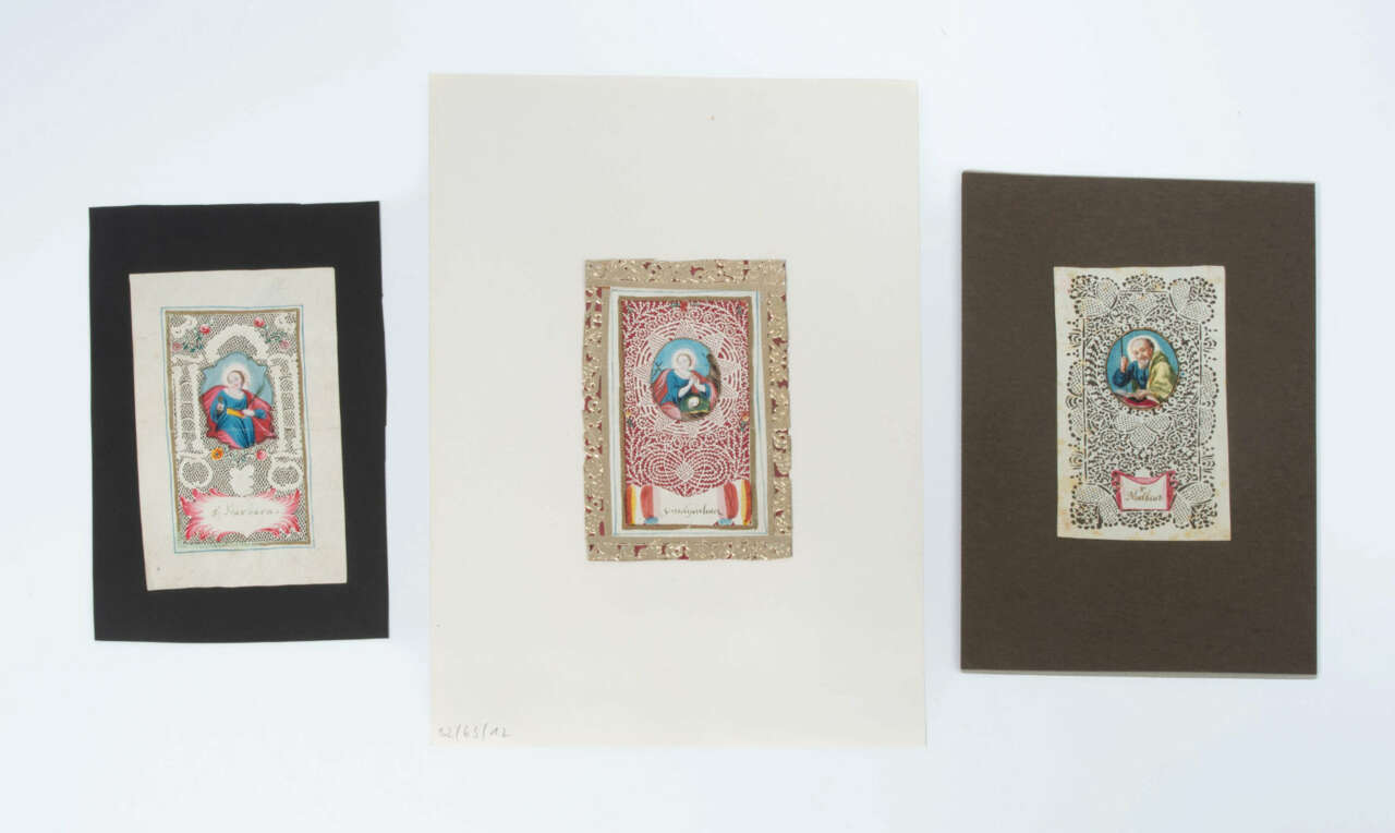 Süddeutsch, 18.Jh. Pergament geschnitten, gestichelt und genadelt, partiell gouachiert. Zentrale Gouacheminiaturen. Hl. Magdalena mit Schädel, Hl. Matthäus mit Buch und Hl. Barbara mit Kelch. Schriftband "S: Magdalena" bzw. Schriftkartuschen "S. Matheus" und "S: Barbara". Feinster Spiralranken- und Ästchenchnitt mit Blumen sowie Netzmaschenschnitt (Hl. Barbara). 10x5,5 cm, 11x6 cm und 9,5x5 cm (Schnitt). Ungerahmt.