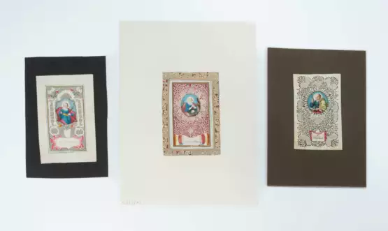 Lot 397 | 3 Spitzenbilder "Hl. Magdalena"/"Hl. Matthäus"/"Hl. Barbara"
