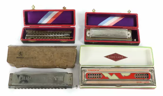Lot 624 | 3 x Mundharmonika Hohner, 1 x Echo-Luxe, 1920er Jahre mit Art-Deco-Dek…
