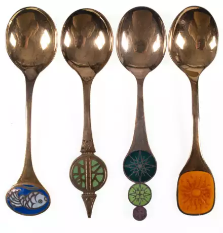Lot 718 | 4 Jahreslöffel, Robbe & Berking, 925er Silber vergoldet, 1969, 1970, 1973 und1974, Stielende emailliert, 1x besch., Ges. Gew. 236 g
