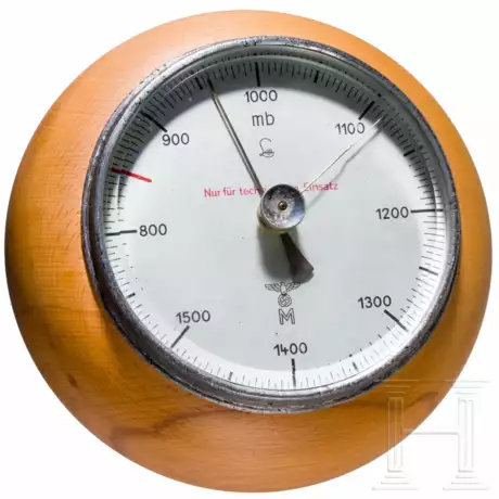 Grob gereinigtes Gehäuse, versilbertes Zifferblatt mit schwarzen arabischen Ziffern von 800 - 1500 mb, Logo des schwäbischen Herstellers Lufft über "Nur für technischen Einsatz" und Marineabnahme M mit Hoheitsadler sowie punzierte Nummer "432/Obs". Im neuzeitlichen Holzrahmen mit ca. 18 cm Durchmesser. Funktion nicht überprüft.