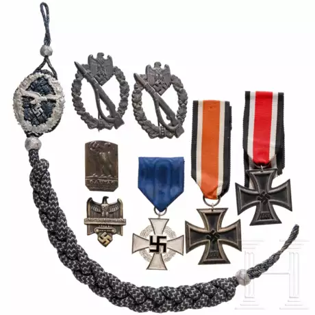 Treudienst-Ehrenzeichen für 25 Jahre am Band, zwei Eiserne Kreuze 2. Klasse 1939 am Band, eines mit Hersteller "19" (F. Wiedmann), Infanterie-Sturmabzeichen in Silber, Hersteller "GWL" sowie der sog. Hersteller "H", zwei Veranstaltungsabzeichen und eine Schützenschnur der Lufwaffe 1. Klasse. Alters- und Gebrauchsspuren.