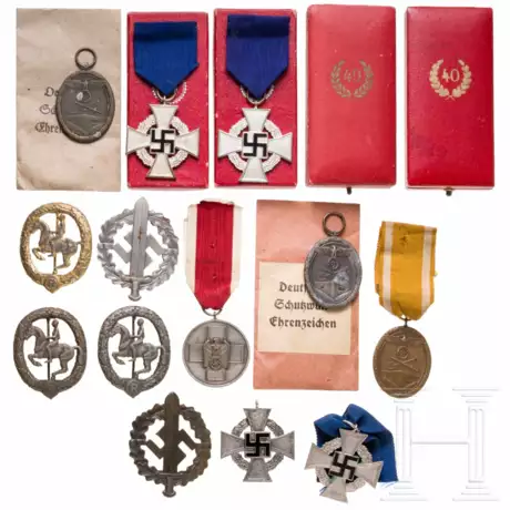 Vier Treudienst-Ehrenzeichen für 25 Jahre, zwei mit dem orig. Verleihungsetui, Medaille für Deutsche Volkspflege, drei Schutzwall-Ehrenzeichen, zwei mit der orig. Verleihungstüte, SA-Sportabzeichen in Silber und Bronze, Deutsches Reiterabzeichen in Gold und Bronze (zwei Stück) und zwei Verleihungsetuis zum Treudienst-Ehrenzeichen für 40 Jahre (ohne Orden). Teils mit Ordensband. Alters- und Gebrauchsspuren.