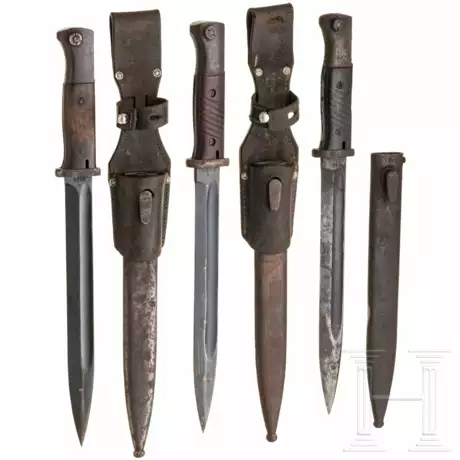 Drei Seitengewehre 84/98, alle mit Abnahmestempel, Hersteller (Code) auf der Klinge, zwei SG sind nummerngleich, anbei zwei Koppelschuhe. Alters- und Gebrauchsspuren.