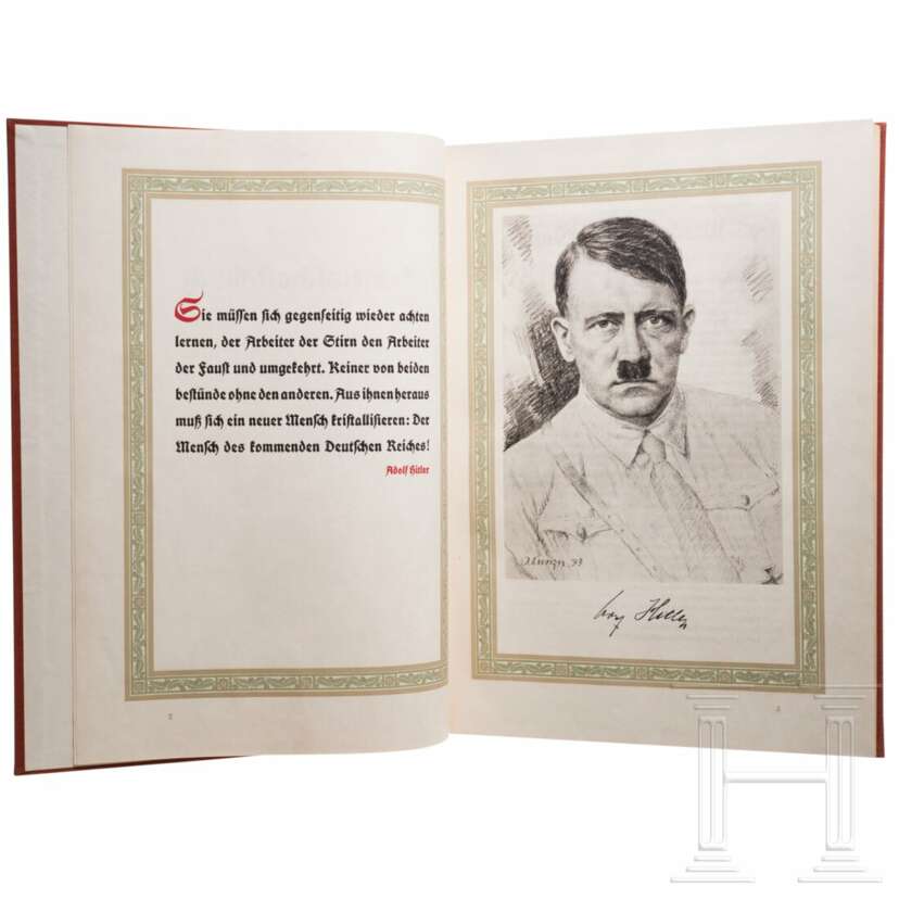 Großformatige Ausgabe mit goldgeprägtem roten Leineneinband, auf den Vorsatzblättern die Geschichte der DAF und der Wirtschaft, die unausgefüllten farbigen Schmuckseiten für Dokumente, Fotos, Protokolle usw. des Betriebes. Im beschädigten Schuber. Maße ca. 30 x 43 cm. Selten.