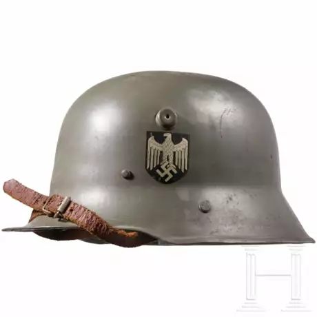 Feldgrau lackierter Helm, seitlich mit eingenieteten Belüftungsbolzen, Doppelabzeichen, diese vollständig erhalten, der WH-Adler hat die Originalgröße eines "echten" WH-Helmes. Komplett mit Innenfutter und Kinnriemen. Alters- und Tragespuren.
