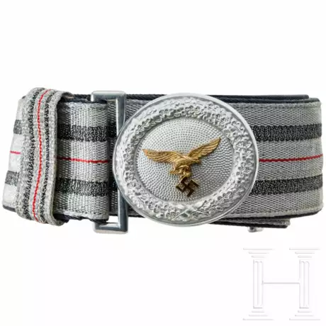 Aluminiumschloss mit vernieteter goldener Adlerauflage und rs. punziertem Assmann-Logo. Die Binde aus Aluminiumgespinst mit farbigen Durchzügen und blauem Futter, komplett mit beiden Schiebern und Gegenhalt.