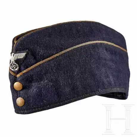 Cap body of dark blue wool, boat-shaped, gilt piping, two gilt pebbled buttons, machine-woven silver-aluminum eagle on black backing, hand-applied. Black artificial silk lining, black oilcloth RZM tag, partial leather sweatband missing. Size ca. 56.