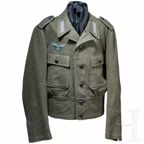 Kammerstück aus feldgrauem Wollstoff mit einteiligem Rückenteil, blaugrauen Knöpfen und grauem Baumwollfutter mit RBNr- und Größenstempelung aus Essen 1944. Maschinenvernähte, mattgraue Einheitskragenspiegel und Brustadler (Dreiecksform), aufgeschlaufte feldgraue Schulterklappen M 44 mit weißen Vorstößen.