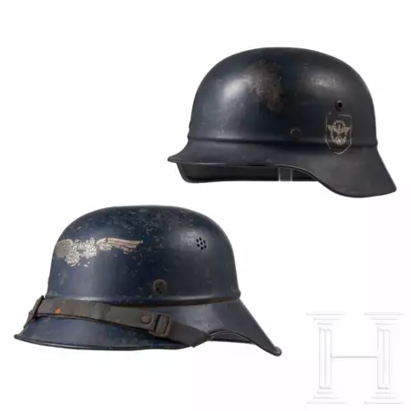 Feuerschutzpolizei-Stahlhelm, orig. Lackierung, diese zu ca. 95 % erhalten, Doppelabzeichen, innen gestempelt "E.T.62" und "20427 2", mit Innenfutter, der Kinnriemen fehlt. Reichsluftschutzbund-Stahlhelm, orig. Lackierung, diese zu ca. 90 % erhalten, vorne mit Luftschutz-Schwinge, mit Kinnriemen und Innenfutter. Alters- und Gebrauchsspuren.