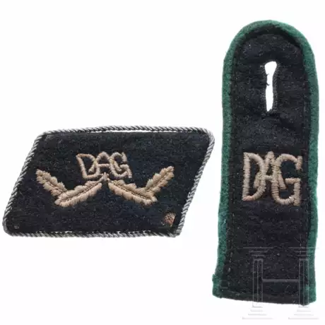 Jeweils Einzelstücke, ein schwarzer Kragenspiegel mit hell gesticktem Schriftzug "DAG" über Eichenlaubblättern. Mottig. Ein schwarzes Schulterstück mit hell gesticktem Schriftzug "DAG" und dunkelgrünem Vorstoß.