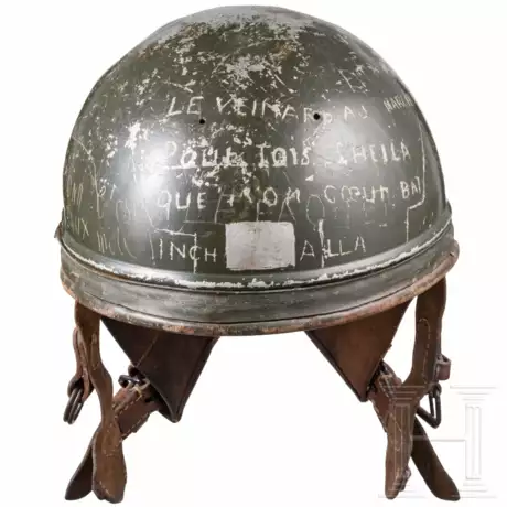 1. Modell nach 1945. Die grün lackierte Aluminiumglocke (Dellen, Fehlstellen und eingeritzte Beschriftung) mit vernietetem Futter (die Filzpolsterung mit Insektenfraß) und Beriemung (bedarfsmäßige Textilverlängerung). Die Nieten von außen mit einem Band abgedeckt. Sichtlich getragener, sehr seltener Helm.