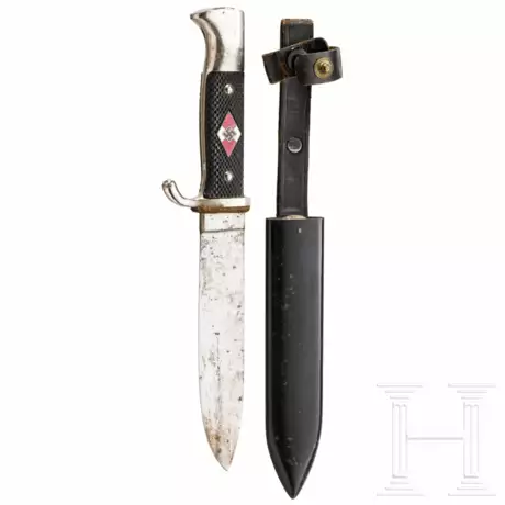 Die Klinge ohne Devisenätzung, mit Hersteller "Carl Wüsthof" und RZM-Herstellercode "M7/112", fleckig auf beiden Seiten, schwarz gewaffelte Griffschalen mit HJ-Raute, orig. schwarz lackierte Stahlscheide mit Trageleder, Alters- und Gebrauchsspuren.