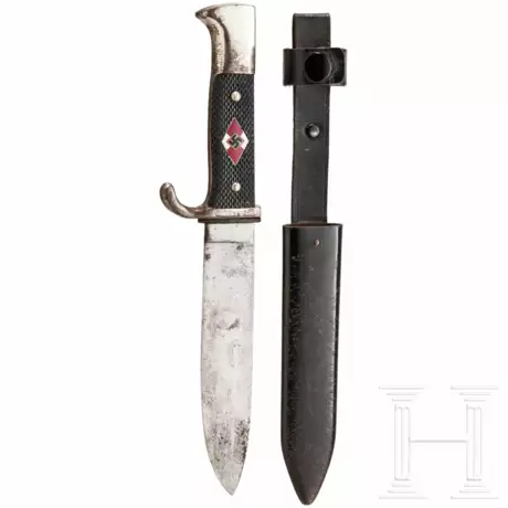 Die Klinge ohne Devisenätzung, RZM-Herstellercode "M7/13" (Schüttelhöfer Artur & Co.), fleckig auf beiden Seiten, schwarz gewaffelte Griffschalen mit HJ-Raute, vernickeltes Griffstück aus Eisen, orig. schwarz lackierte Stahlscheide mit Lederhänger. Alters- und Gebrauchsspuren.