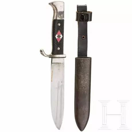Klinge ohne Devisenätzung mit quartseitiger RZM-Codierung "M7/13". Vernickeltes (Fehlstellen) Griffstück, die vernieteten, gewaffelten, schwarzen Griffschalen mit eingelegtem HJ-Emblem. Flugrostige Eisenscheide mit lederner Trageschlaufe. Länge ca. 24,5 cm.