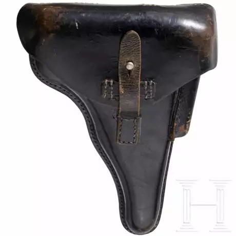 Aus dickem schwarzen Leder mit seitlicher Magazintasche, innenseitigen Zugriemen und zwei rs. Trageschlaufen, daneben gelöschte Stempelung sowie neue Nummer "230 664".