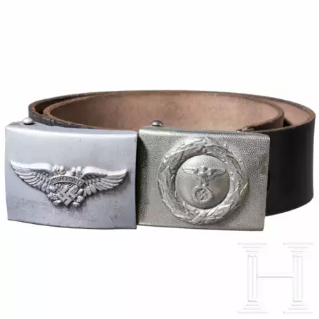 Koppelschloss des Deutschen Luftsportverbandes (DLV), frühe Nickelausführung, typische Fertigung der Fa. Assmann & Söhne, mit Lederriemen, gestempelt "Kernleder" und "L2/2613", Länge ca. 90 cm. Koppelschloss des Luftschutzwarndienstes (SHD), Eisen versilbert, typische Fertigung der Fa. Richard Sieper & Söhne. Alters- und Tragespuren.