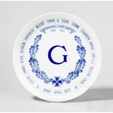 Weißes, glasiertes Porzellan mit blauem Dekor, mittige Chiffre "G" zwischen entsprechender Aufschrift und dem EK 1939 sowie umgebendem Eichenlaubkranz. Auf der Fahne die Gefechte in Polen und Frankreich. Im Boden die blaue Schwertermarke, rs. Möglichkeit zur Drahtaufhängung. Durchmesser 25,5 cm. Unbeschädigt.