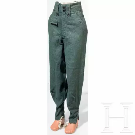 Kammerstück aus feldgrauer Reißwolle mit dunklen Kunstharz-, Glas- und Hornknöpfen. Erhöhte Hinterhose mit Gürtelschlaufen zum Tragen mit Hosenträgern, verdeckte Knopfleiste, eingearbeitete Uhrentasche mit Verschlussklappe, die schräg eingearbeiteten Vordertaschen und die rechtsseitige, gerade eingearbeitete Gesäßtasche mit Verschlussknöpfen, Gesäßverstärkung, Beinabschluss mit Überfall. Weißes Futter mit Größenstempelung.