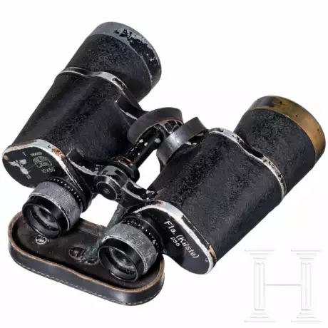 Das Gehäuse mit schwarzem Krausslack, bez "Fla. (Küste) 255" und "Carl Zeiss Jena - T - 1904455" sowie Marineabnahme "M" über Hoheitsadler (Hakenkreuz entfernt - Swastika removed), Optik (trüb) mit Strichplatte. Eine der vorderen Einfassungen ergänzt, originale Knopflochlasche und Okularabdeckung.