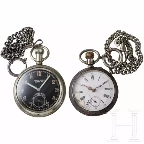 Eigentumsstück(?) ohne jegliche militärische Kennzeichnung. Das schwarze Ziffernblatt mit nachtleuchtenden arabischen Indizes und Zeigern, kleiner Sekunde auf der "6" und Hersteller-/Verkäuferaufschrift "Uhrenfabrik Büren A.G. - A. Lünser, Berlin", Handaufzugswerk, bez. "Buren Grand Prix". Durchmesser ohne Krone ca. 52 mm. Funktionsfähig. Dazu eine sichtlich beschädigte, defekte zivile Taschenuhr.