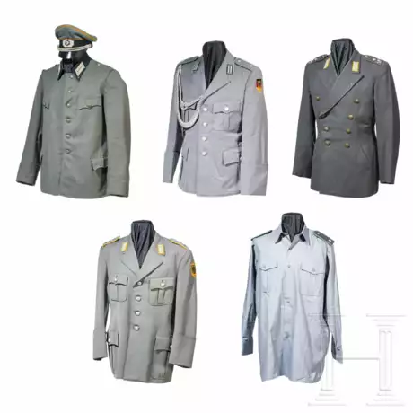 Schirmmütze und eine unbekannte Uniformjacke mit Offizierskragenspiegeln. Dazu drei Bundeswehrröcke: zwei eines Oberstleutnants der Aufklärer und einer eines Leutnant der Gebirgstruppe.