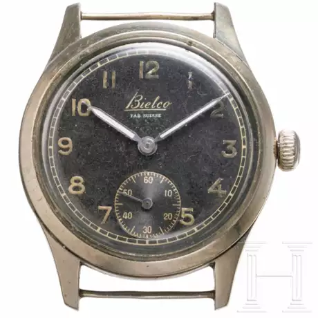Armbanduhr mit vernickeltem Gehäuse, schwarzem Zifferblatt mit Markenname "Bielco", Leuchtindizes und -zeigern. Handaufzugswerk im Wehrmachtskaliber (Halteschräubchen fehlt) AS 1130. Der rs. Schraubdeckel mit punzierter Abnahme "D U" (Zivilverwaltung?) und laufender Nummer. Durchmesser ohne Krone ca. 34 mm. Funktionsfähig.